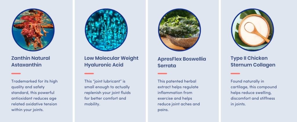 | Mechanisms of Action | Reduces joint discomfort via boswellia (AprèsFlex®). Provides antioxidant protection with astaxanthin, which may reduce oxidative stress in joint tissues. Rebuilds or maintains connective tissue: collagens help support cartilage, ligaments, and other joint structures. Improves joint lubrication via hyaluronic acid, which supports synovial fluid viscosity. | Supports cartilage structure using glucosamine, which is part of the cartilage matrix. Manages inflammation / joint pain via the boswellia extract 5-LOXIN, which contains AKBA (a boswellic acid). Helps with repair and maintenance through MSM (in some versions) which contributes sulfur for connective tissues (if using the MSM variant). Provides joint support + antioxidant capacity via Vitamin C. |